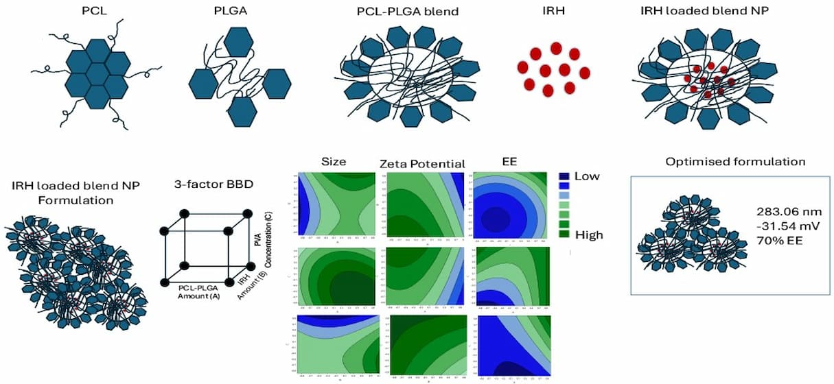 This study demonstrates that blending PCL with PLGA can be strategically employed to tailor NP properties, thereby enhancing their suitability as carriers for hydrophilic drugs such as IRH. Careful control of polymer ratios, drug amount, and surfactant levels was shown to significantly influence particle size, surface charge, and EE, with the balanced 50:50 PCL:PLGA blend achieving optimal physicochemical performance. Using the BBD, this study identified the predicted optimal formulation consisting of 162 mg polymer blend, 8.37 mg drug, and 8% surfactant, which is expected to yield NPs with a size of 283.06 nm, zeta potential of −31.54 mV, and EE of 70%. The application of BBD allowed systematic evaluation of the factors and their interactions, providing robust predictive models supported by regression and ANOVA analyses. These findings highlight the potential of polymer blends to improve EE while maintaining stability and desirable surface characteristics.