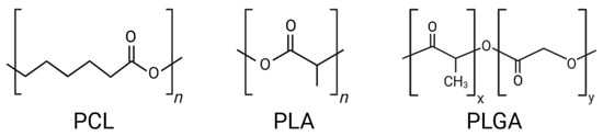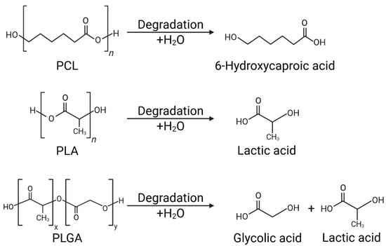 Polycaprolactone (PCL), polylactic acid (PLA), and poly(lactic-co-glycolic acid) (PLGA) are all aliphatic polyester polymers containing ester bonds, exhibiting unique biodegradation behaviors depending on their chemical composition and microstructure (Figure 1).