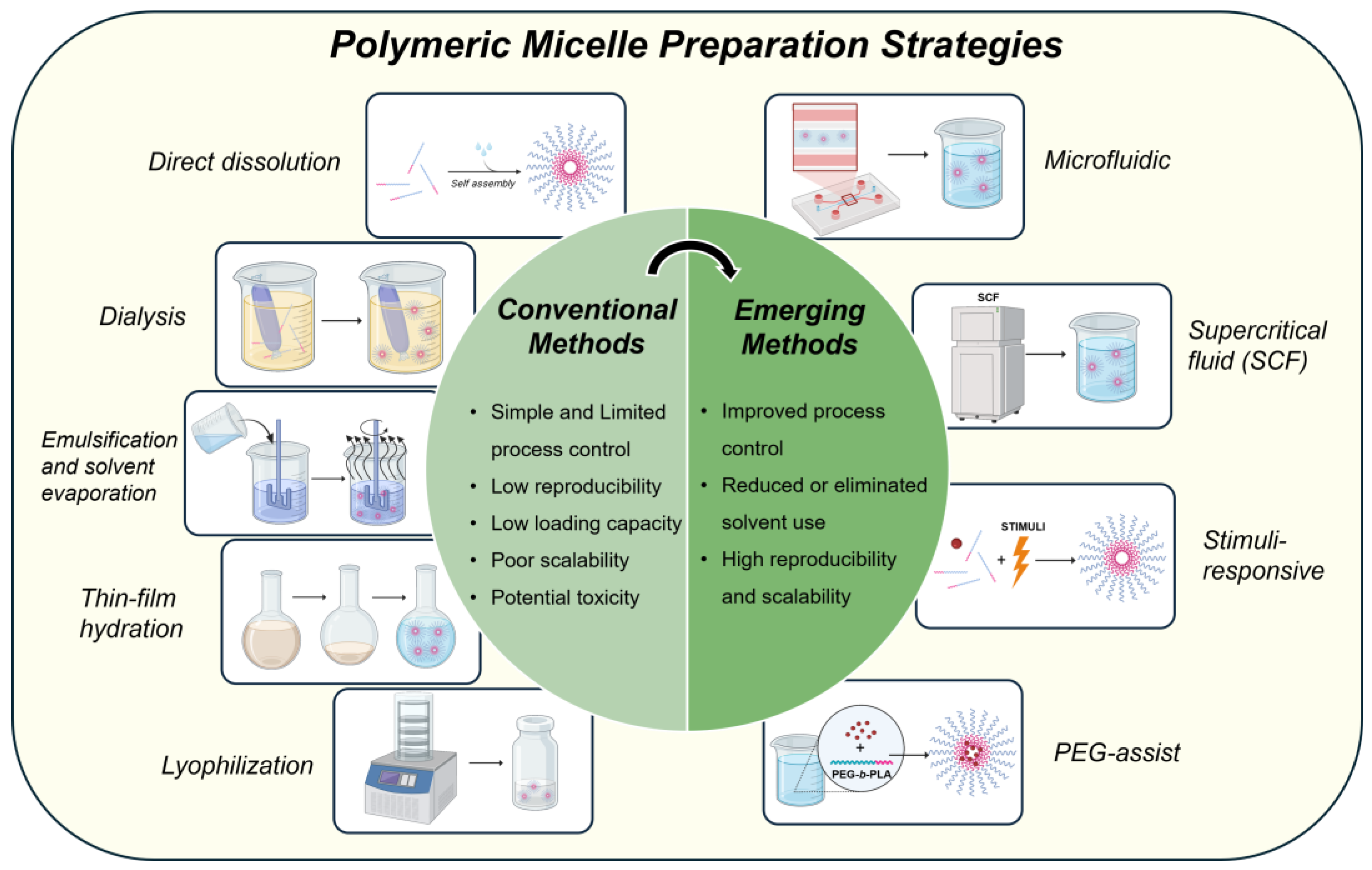 | Supercritical Fluid (SCF) | Processing of polymers and drugs using supercritical fluids | Avoidance of toxic solvents, solvent-free or solvent-minimized conditions, formation of dry micellar powders | Requirement for high-pressure equipment, narrow processing window, need for specialized formulations | [35,39,109,110] |