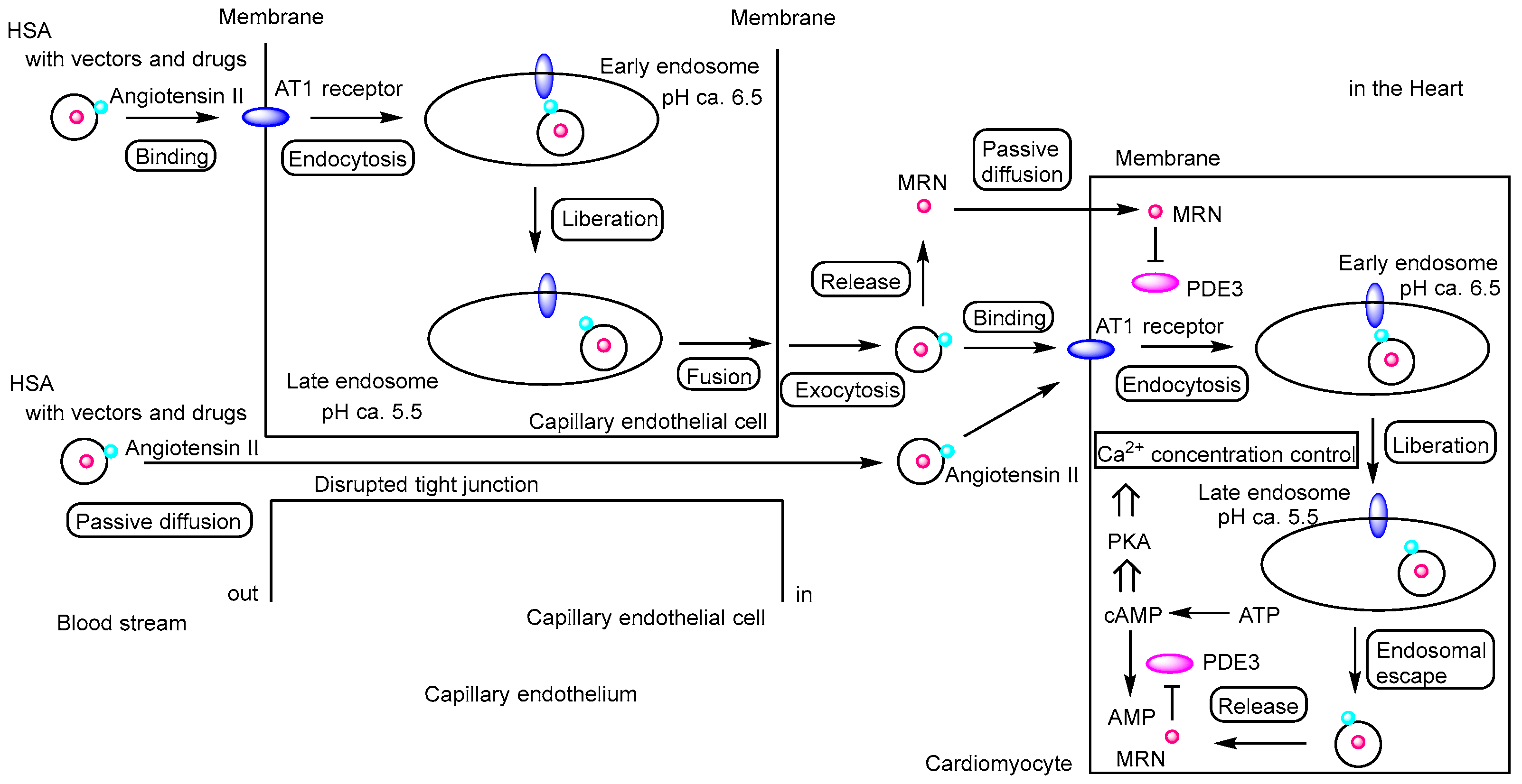 | i | MRN-loaded nanoparticles based on human serum albumin (HSA), surface-modified with angiotensin II | HSA, angiotensin II | MRN | Basic research | [35] |