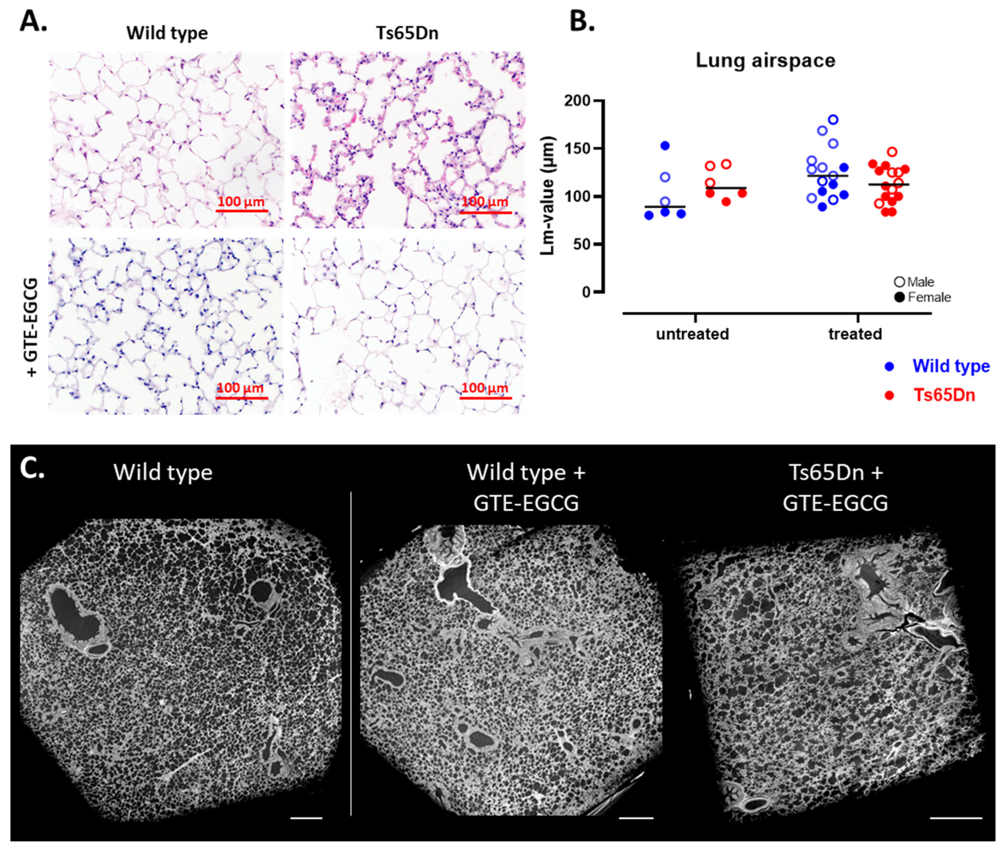 3.2. Characterization of the Structural and Functional Pulmonary Phenotype of Ts65Dn Mice Throughout Development and Modulatory Effects of GTE-EGCG