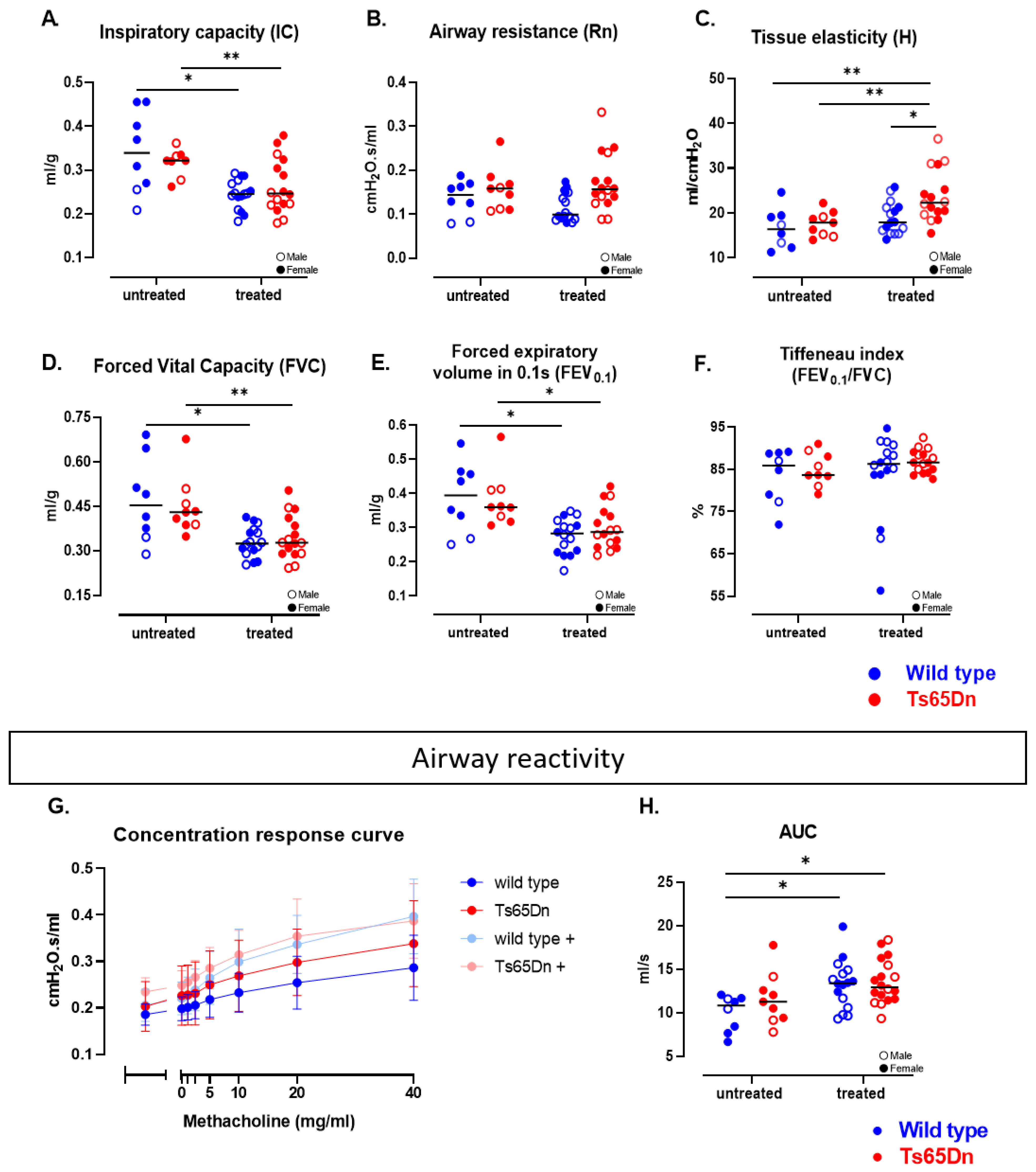 3.2.3. WT and Ts65Dn Littermates Present with Equal Pulmonary Lung Function and Airway Reactivity