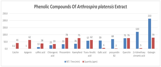HPLC analysis of A. platensis extract led to the identification of 12 phenolic compounds (Figure 1). Among these, prominent flavonoids such as galangin (78.62 ± 3.93 ppm), pinocembrin (78.15 ± 3.91 ppm), and kaempferol (75.47 ± 3.77 ppm) were present in high concentrations, highlighting A. platensis as a rich source of bioactive flavonoids. Apigenin (62.41 ± 3.12 ppm) and trans-ferulic acid (62.28 ± 3.11 ppm) were present at moderate levels. In contrast, catechin (41.27 ± 2.06 ppm), gallic acid (6.16 ± 0.31 ppm), and procyanidin B2 (2.96 ± 0.15 ppm) were detected in lower concentrations, while 2,4-dimethoxy cinnamic acid (5.00 ± 0.25 ppm) was also identified among the minor compounds (Table 2).