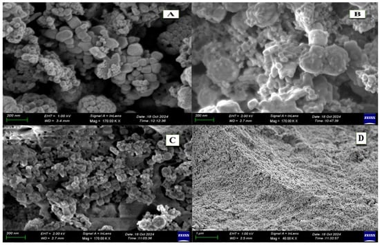 The FE-SEM analysis revealed clear morphological differences between the biosynthesized ZnO NPs, pure ZnO NPs, and the A. platensis extract (Figure 2). The biosynthesized ZnO NPs produced at 80 °C (Figure 2A) showed polydispersed, irregular granular structures with an average size of 45.2 ± 8.6 nm (n = 100), while the calcined sample at 400 °C (Figure 2B) exhibited more compact and angular nanoparticles averaging 37.1 ± 6.3 nm. In contrast, the pure ZnO NPs (Figure 2C) were predominantly uniform and smaller (26.4 ± 4.1 nm), while the A. platensis extract alone (Figure 2D) displayed amorphous, irregular structures.