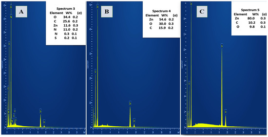 The EDX analy sis presented in Figure 3 illustrates the elemental composition of A. platensis-mediated ZnO NPs synthesized at two different conditions: 80 °C (A) and 400 °C (B), along with pure ZnO NPs (C). In spectrum 3 the elemental composition of ZnO NPs synthesized at 80 °C shows a significant presence of carbon (34.4%), oxygen (25.6%), and zinc (18.8%), with additional minor elements such as nitrogen, sodium, phosphorus, sulfur, and magnesium. In contrast, the EDX spectrum of ZnO NPs synthesized at 400 °C (spectrum 4) reveals a markedly higher zinc content (54.0%) and lower carbon (15.9%), while oxygen levels remain relatively consistent (30.0%), and a similar pattern can be observed in the pure ZnO NPs sample (spectrum 5), which shows the highest zinc content (80.0%) with minimal oxygen (9.8%) and carbon