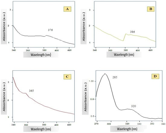 UV–Vis absorption spectra of A. platensis-mediated ZnO NPs synthesized at 80 °C (A) and 400 °C (B), pure ZnO NPs (C), and A. platensis extract (D).
