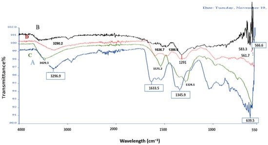 FT-IR spectra of A. platensis-mediated ZnO nanoparticles synthesized at two different temperatures: 80 °C ((A), blue line) and 400 °C ((B), black line), ((C), green line: A. platensis Extract), ((D), red line: pure ZnO NPs).