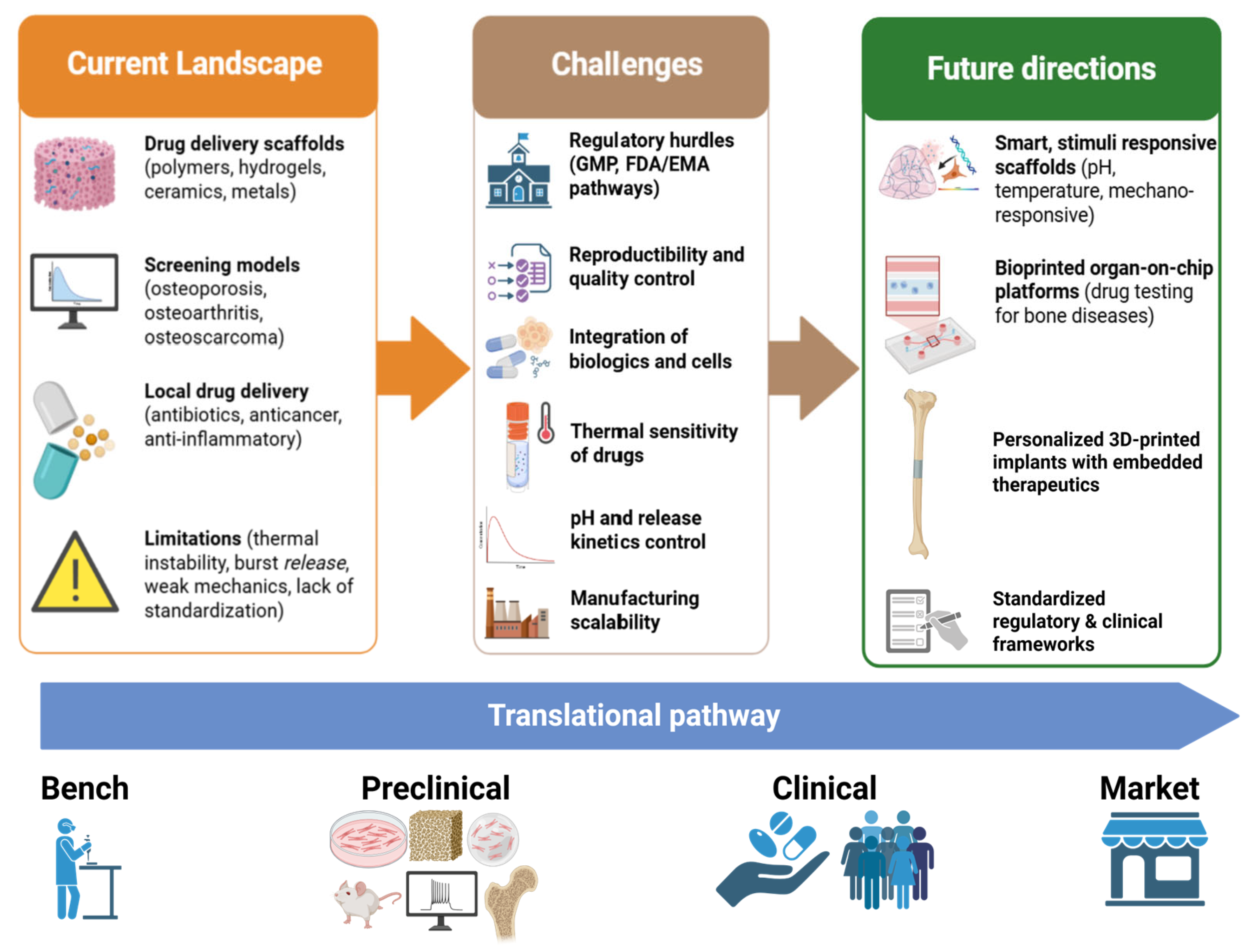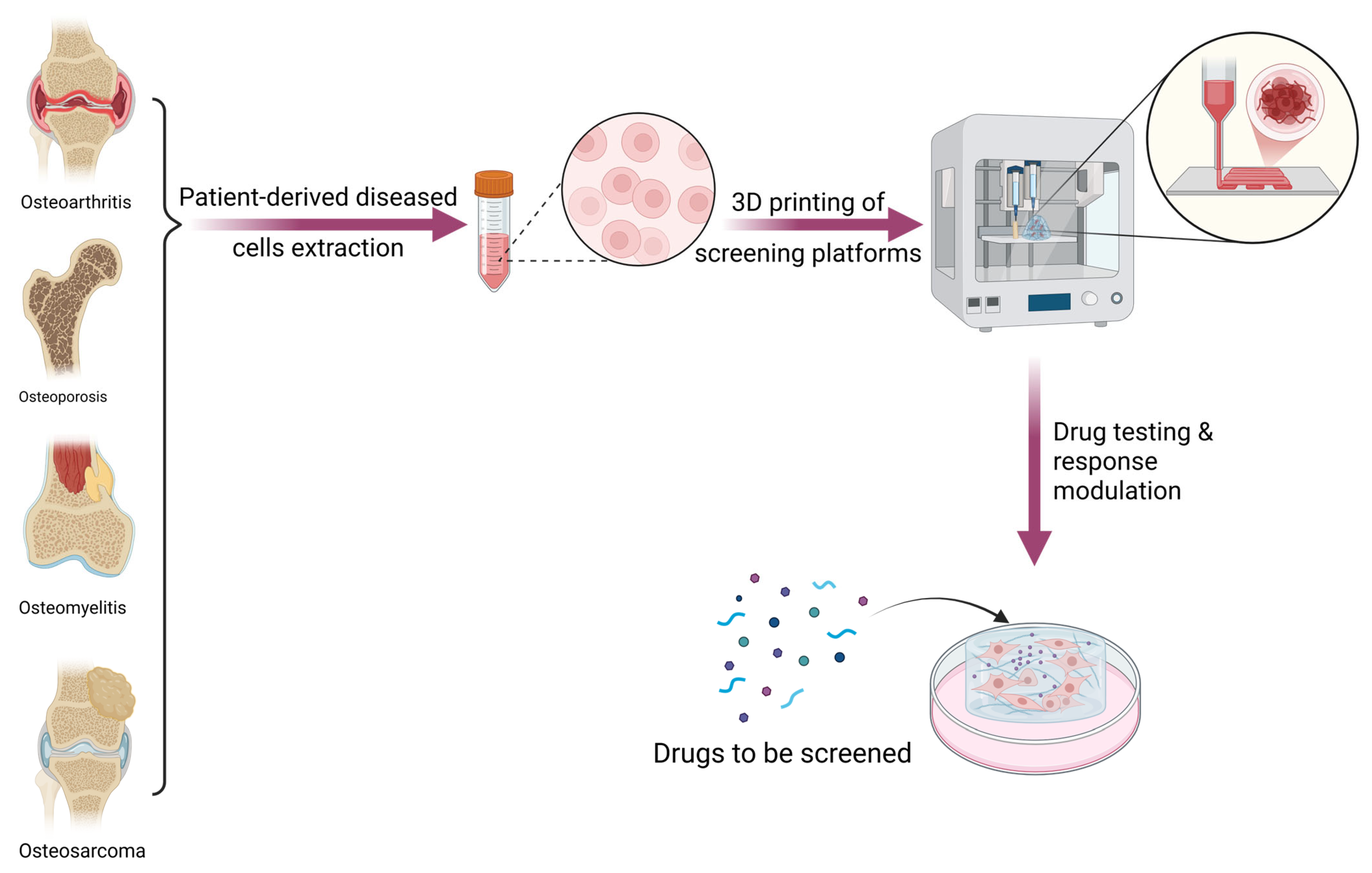 Due to these advantages of 3D printing, this technology has been especially significant in the field of orthopedics and craniofacial surgery, particularly in bone pathologies where traditional models may not sufficiently capture the complexity or biology of bone tissue architecture [12]. Bone-specific diseases, including osteoporosis, osteoarthritis, and bone cancers, pose unique therapeutic and modeling challenges to the development of therapeutics, drugs, and biologics because of the complexities of their pathophysiology and the need for a targeted, localized treatment approach [13,14,15]. Typically, traditional techniques do not allow for drugs to be effectively delivered to the bone or lack the ability to replicate the native bone microenvironment for testing. 3D printing has opened doors for designing and fabricating bone-mimetic scaffolds, as well as in vitro models of bone diseases that would exhibit structural and mechanical properties of native bone [16,17]. The ability to control the architecture and composition of a material enhances the application of 3D printing in studying more physiologically relevant conditions, including bone regeneration processes, drug release characteristics, and cellular behavior.
