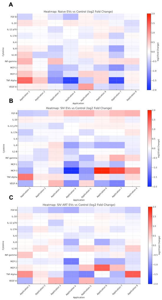 EVs from different SIV disease states differentially modulate glial cytokine secretion across repeated exposures. Heatmap visualization of cytokine secretion profiles from primary mixed glial cultures treated with EVs derived from (A) naïve (uninfected) animals, (B) SIV-infected animals, and (C) SIV-infected animals receiving antiretroviral therapy (ART), compared to vehicle-treated controls. Further comparisons were performed between naïve EVs and SIV EVs (D), naïve EVs and SIV ART EVs (E), and SIV ART EVs and SIV EVs (F).Cytokine concentrations were measured in culture supernatants prior to each successive EV application (Application 1–8) and expressed as log2 fold-change versus baseline (control). Red indicates increased cytokine levels; blue indicates reduced levels relative to control. Each column represents a cytokine measurement prior to the indicated EV application.