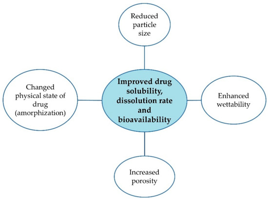 Poor water solubility is one of the main reasons for inadequate drug bioavailability and unsuccessful formulation development steps. To improve solubility, different strategies are employed and various techniques are studied, such as micronization, salt formation, complexation, use of surfactants and solubilizers [1,2,3]. Solid dispersions (SDs) constitute one of the approaches to enhance drug solubility, especially promising for drugs belonging to a Biopharmaceutics Classification System (BCS) class II, characterized by low solubility and high permeability [4,5,6,7]. SDs are described as a mixture of at least two components, a hydrophobic drug and a hydrophilic matrix. They can lead to particle size reduction, increased wettability and porosity, reduced agglomeration and drug amorphization (Figure 1) [8,9,10].