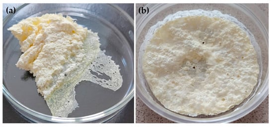 In the second method to obtain SDs, a lyophilizer Alpha 2-4 LSC Basic (Martin Christ, Osterodeam Harz, Germany) was used (Figure 2). In the first step, aqueous dispersions of the drug and polymer were prepared. For this, 1 g of etodolac was dissolved in 96% ethanol, and the carrier was solubilized in 20 g of water. Then, these two phases were blended using a magnetic stirrer (400 rpm), mixed and heated (50 °C ± 2 °C) until the organic solvent evaporated (the volume of solution was reduced to half of the initial state). Liquid formulations were put in plastic boxes and frozen with liquid nitrogen (−196 °C, 5 min) or in the freezer (−80 °C, 24 h). Then, frozen formulations were lyophilized for 24 h under pressure 0.05 mBar (−48 °C), with additional drying step for 2 h (0.005 mBar). Lyophilized SDs were stored in a desiccator with anhydrous calcium chloride. The compositions of ETD–SD prepared by lyophilization are presented in Table 2.