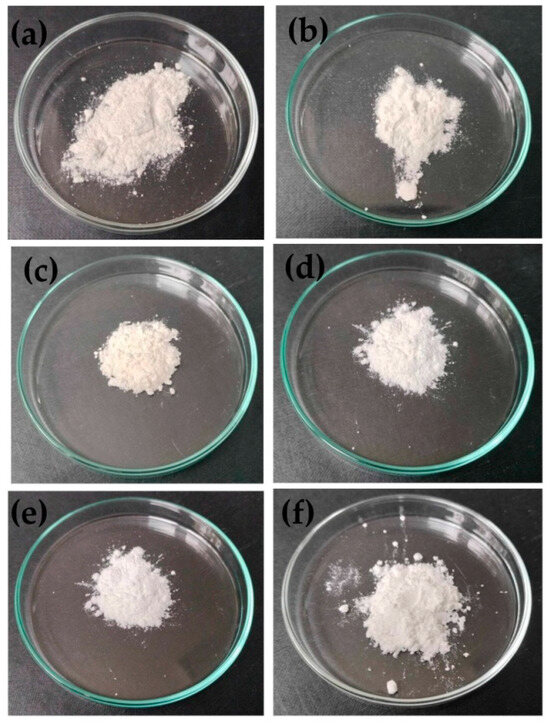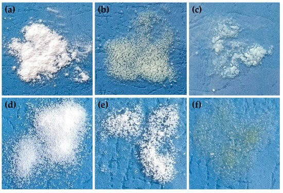 Visual appearance of (a) K00, (b) K2-60, (c) K1-60, (d) K3-30, (e) K4-30 and (f) K5-30.