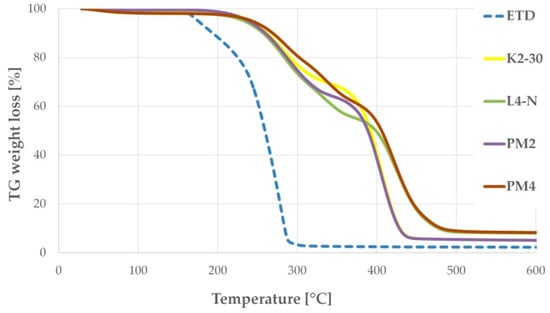 Thermogravimetry (TG) is an important analytical method that enables us to observe the thermal stability of excipients, weight loss due to desolvation and thermal degradation. In this study, pure ETD, selected PMs and SDs were analyzed by thermogravimetric tool to assess their thermal stability, prior DSC examination. Figure 6 presents no loss of ETD mass up to about 158 °C, which indicates its stability over the melting point, and followed by thermal decomposition progressing to about 290 °C [12,56]. In TGA spectra of PMs and SDs, a shift in the ETD mass loss was recorded at temperature above 170 °C. Thermal degradation of ETD in PMs and SDs occurred slowly. In formulations with HPMC and poloxamer (PM2, K2-30), the substances lost entire mass at below 450 °C, whereas formulations with PVP/VA and poloxamer (PM4, L4-N) kept decomposing to about 480 °C. This study noticeably confirmed delayed decomposition of ETD when it was bounded with carriers, both in the form of PM and SDs. This fact was described also by Gupta R.D. and Raghav N. [56], who studied the drug delivery system of ETD and nanocrystalline cellulose obtained by the grinding method and showed that the bounded drug exhibits higher thermal stability.