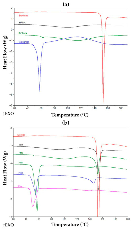 DSC thermograms of (a) unprocessed ETD and carriers and (b) unprocessed ETD and PMs. ↑EXO indicates an exothermic direction (heat release).