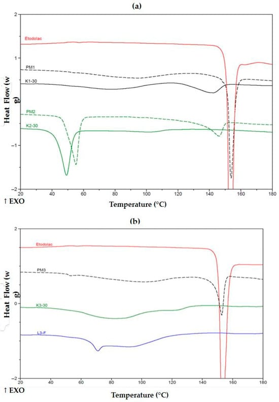 DSC thermograms of (a) unprocessed ETD, PMs (PM1, PM2) and SDs (K1-30, K2-30) and (b) ETD, PM3, K3-30 and L3-F. ↑EXO indicates an exothermic direction (heat release).