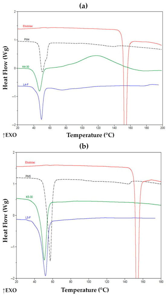 DSC thermograms of (a) ETD, PM4, K4-30 and L4-F and (b) ETD, PM5, K5-30 and L5-F. ↑EXO indicates an exothermic direction (heat release).