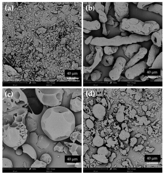 SEM analysis was performed for unprocessed ETD, carriers, cryo-milled and lyophilized ETD and SDs obtained by both methods. As shown in Figure 10, ETD existed as different-size particles (most of them below 40 µm), characterized by flat surfaces with sharp edges. HPMC was characterized as large, elongated fragments (“worm-like”), PVP/VA as big spherical particles with smooth surface and pores, while poloxamer appeared in variable shapes, mainly as spherical particles with smooth surfaces [58,59,60,61,62,63].
