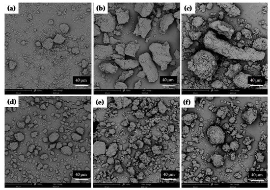 SEM images of cryo-milled ETD: (a) K0, (b) ETD–SD with HMPC (K1-60), (c) ETD–SD with HPMC and poloxamer (K2-30), (d) ETD–SD with PVP/VA (K3-30), (e) ETD–SD with PVP/VA and poloxamer (K4-30) and (f) ETD–SD with poloxamer (K5-30) (magnification 1000×).
