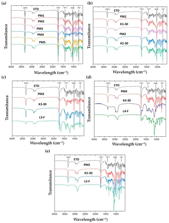 FTIR spectra of unprocessed (a) ETD and PMs, (b) unprocessed ETD, PM1, PM2, K1-30 and K2-30, (c) unprocessed ETD, PM3, K3-30 and L3-F, (d) unprocessed ETD, PM4, K4-30 and L4-F and (e) unprocessed ETD, PM5, K5-30 and L5-F.