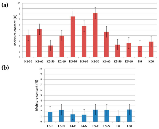 Prepared SDs were assessed by moisture content and hygroscopicity, as described in Section 2.8. It was noticeable that lyophilized SDs were characterized by lower humidity (Figure 14). The moisture content in the lyophilized SDs ranged from 1.08 to 2.32%, while in the cryo-milled SDs ranged from 2.05 to 8.21%. However, it should be noted that the moisture content in all SDs was at a low level (below 10%), and the lower humidity of lyophillized SDs related to the type of SDs preparation method. During the lyophilization method, at first, water in the formulations is frozen, then it is converted to steam in a sublimation reaction [37,70]. Additionally, in our study, an extra drying step (2 h) was applied, which resulted in a lower moisture content in the final products.