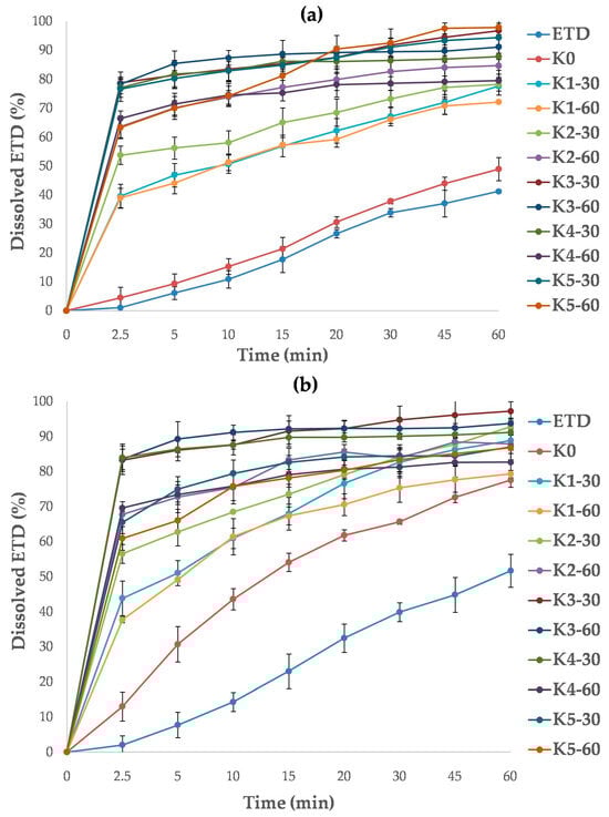 The dissolution study was performed using two buffers as dissolution media: phosphate buffer (pH 7.4) and acetate buffer (pH 5.5). For all cryo-milled SDs, the dissolution rate of ETD in acetate buffer was significantly improved (p < 0.05, Figure 16a). The best dissolution rates were confirmed for K3-30, K3-60, K5-30 and K5-60 formulations and increased from 60.90% to 78.74% at 2.5 min and from 86.76% to 96.74% at 60 min. SDs containing HPMC were characterized by the lowest dissolution rate (ETD dissolution about 80% after 60 min). The ability to improve the dissolution rate can be arranged in the following order: poloxamer > PVP/VA > PVP/VA + poloxamer > HPMC + poloxamer > HPMC. In comparison, the dissolution rate of pure ETD and cryo-milled ETD (K0) was significantly lower, achieving values of 5% at 2.5 min and about 40% at 60 min.