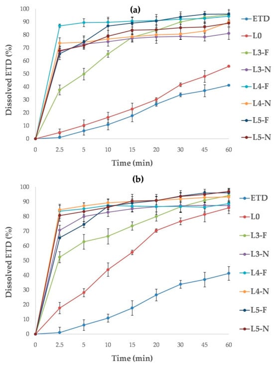 The solubilities of ETD in cryo-milled SDs (Table 3) were in the ranges of 0.10–0.16 mg/mL in water, 0.87–1.37 mg/mL in acetate buffer pH 5.5 and 1.91–2.44 mg/mL in phosphate buffer pH 7.4. Compared with pure ETD and pure milled ETD (K0, K00), a significant improvement in its solubility was observed for all prepared SDs. The maximum ETD solubility in water and buffer pH 5.5 exhibited K2-60 (HPMC + poloxamer), while in buffer pH 7.4-K5-60 (poloxamer). In SDs containing various carriers–HPMC, PVP/VA and poloxamer–no significant differences (p > 0.05) were observed between the ETD solubilities. For each formulation, the best ETD solubility was noted in phosphate buffer (above 2 mg/mL for most SDs), which relates to the chemical properties (acidic nature) of the drug. ETD is characterized by a pKa value of 4.65, which means that at higher pH (pH > pKa), it presents mainly in ionized form and shows better solubility [12,75]. Also, for lyophilized SDs, the ETD solubility was improved compared to pure and lyophilized ETD (L0, L00) (Table 4). In this case, ETD dissolved in water, buffer pH 5.5. and buffer pH 7.4 in the ranges of 0.20–0.43 mg/mL, 1.02–1.69 mg/mL and 2.10–3.08 mg/mL, respectively. The highest ETD solubility in water showed L4-F (PVP/VA, poloxamer), and in both buffers, it showedL3-F (PVP/VA). Similarly to the cryo-milled SDs, the lyophilized SDs showed no statistically significant differences (p > 0.05) in ETD solubility across different carriers. The highest ETD solubility was observed in phosphate buffer at pH 7.4. Comparing the two methods and their effect on improvement of ETD solubility, a greater impact was seen for lyophilized SDs, especially solubility of ETD in water, which was four times greater for lyophilized SDs (formulations with PVP/VA and poloxamer) than for cryo-milled SDs.