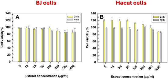 Human dermal fibroblasts (BJ) and keratinocytes (HaCaT) cell lines were used to study in vitro the safety of SM extract. BJ cell line was obtained from ATCC (Manassas, VA, USA) (ATCC® CRL-2522; Cellosaurus ID: CVCL_3653) while HaCaT cell line was provided by Cytion (Cytion, catalog no. 300493; Cellosaurus ID: CVCL_0038). Both cell lines were cultured in Dulbecco’s Modified Eagle Medium (DMEM) under standard conditions. DMEM was supplemented with 1% penicillin–streptomycin and 10% of fetal bovine serum (FBS). BJ and HaCaT cells were seeded into 96-well plates at a density of 5000 and 10,000 cells per well, respectively, and allowed to adhere overnight. The next day, the cells were treated with increasing concentrations of the extract (5, 10, 25, 50, 100, 250, 500, and 1000 µg/mL). Cell viability was assessed after 24 and 48 h of the treatment using the MTT assay. For the assay, 10 µL of MTT solution (5 mg/mL) were added to each well containing 100 µL of culture medium and incubated for 3 h at 37 °C. After incubation, the medium was removed, and the resulting formazan crystals were solubilized with 100 µL of DMSO:EtOH (1:1 v/v ratio) solution under gently shaking for 20 min to ensure the complete dissolution. Absorbance was measured using a Varioskan™ LUX multimode microplate reader (Thermo Fisher Scientific, WI, USA) at wavelengths appropriate for MTT formazan detection (540 nm with reference at 690 nm).