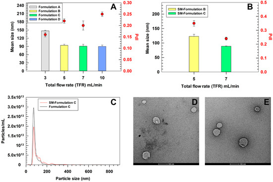 Physicochemical characterization of ultradeformable liposomes. (A) Z-Average and PdI of empty formulations obtained by using four different TFR. (B) Z-Average and PdI of SM-loaded ultradeformable liposomes obtained at TFR of 5 and 7 mL/min. (C) NTA representative curve of size distribution and particle concentration of empty and SM-loaded Formulation C. (D) TEM images of empty Formulation C. (E) TEM image of SM-loaded Formulation C. Results are the mean of three independent experiments ± S.D. Statistical analysis is reported in the supplementary materials (Table S1).