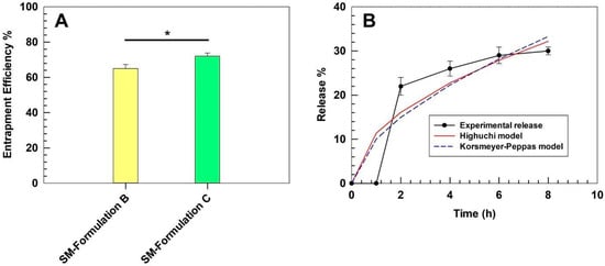 Entrapment efficiency and kinetic release profile. (A) showed the entrapment efficiency of SM-Formulation B and SM-Formulation C, while (B) reported the kinetic release profile of Formulation C (37 ± 0.5 °C). Results are the means of three independent experiments ± S.D. * p < 0.05.