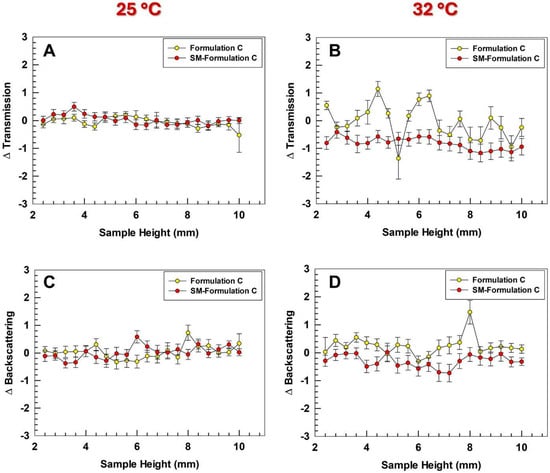 Turbiscan analyses. Variation of transmitted (A,C) and backscatter (B,D) light as a function of sample height. The analyses were performed by using Turbiscan Lab instrument at 25 and 32 °C. Results are the mean of three independent analyses ± S.D.