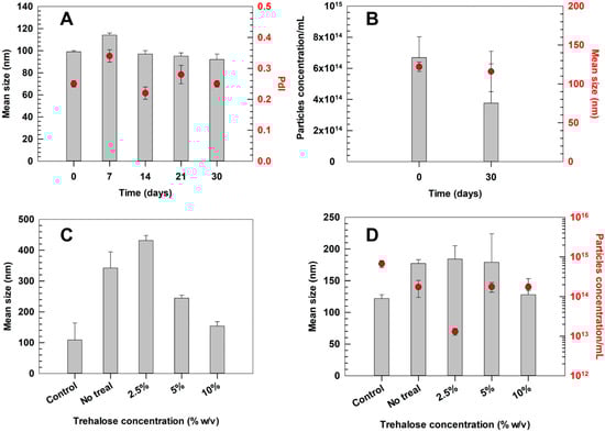 Storage and freeze-drying stability of SM-Formulation C. Stability at +4 °C was studied for up to 30 days and monitored by DLS (A) and NTA (B). The stability to freeze-drying process was investigated as a function of cryoprotectant concentration. SM-Formulation C was analyzed before (control) and after lyophilization by DLS (C) and NTA (D). Results are the means of three independent analyses ± S.D. Statistical analysis is reported in Table S2.