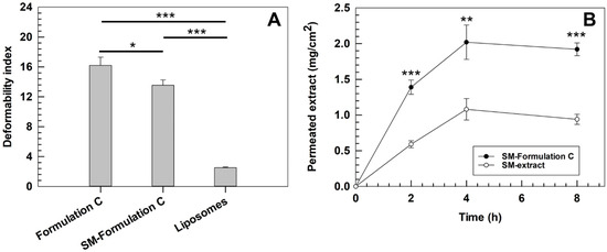 Deformability index (A) and percutaneous permeation (B) studies. Analyses were performed at 32 ± 0.5 °C and results are reported as the mean of three independent experiments ± S.D. * p < 0.05, ** p < 0.01, *** p < 0.001.