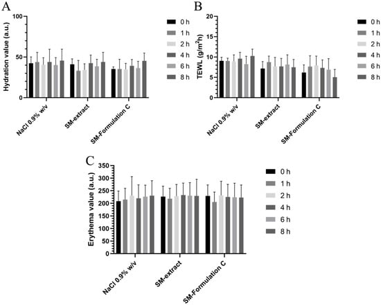 Following topical application of SM-extract and SM-Formulation C, no significant changes in skin hydration were detected (Figure 8A), with results comparable to those obtained after treatment with the saline control (NaCl 0.9% w/v). These findings suggested that the formulations did not affect the hydration balance of the stratum corneum. Likewise, TEWL values remained stable throughout the overall observation period (Figure 8B), further supporting the suitable tolerability profile of SM-extract and SM-ultradeformable liposomes.