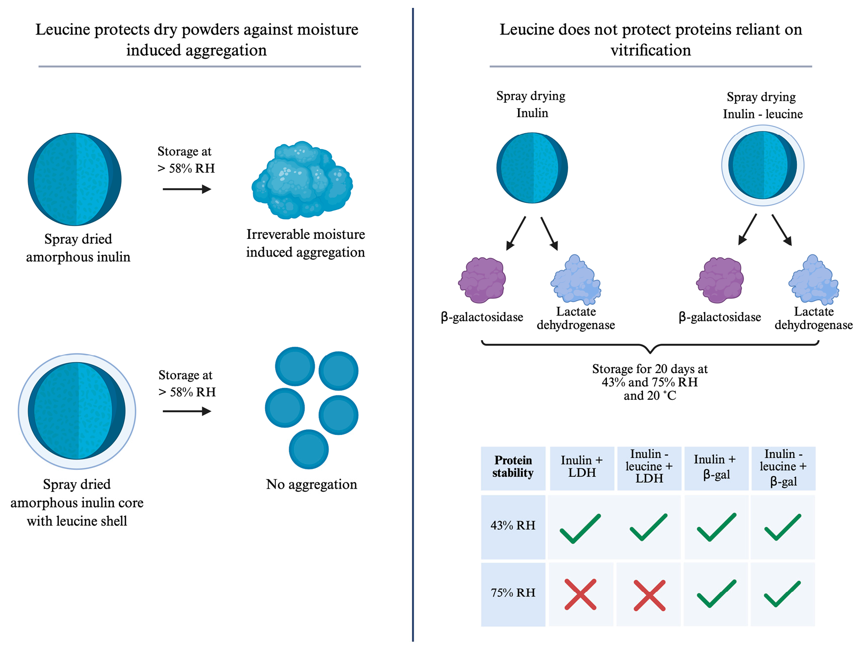 To the best of our knowledge, it was neither investigated whether leucine can protect inulin-based spray dried formulations from irreversible particle aggregation, nor has this been related to the stability of encapsulated proteins that rely on stabilization mechanisms (i.e., vitrification and/or water replacement). In this work, we address this gap by systematically evaluating the effect of leucine on inulin-based powders under controlled RH conditions (43%, 58%, 69%, and 75%) at 20 ± 2 °C. First, the physicochemical properties and primary particle sizes were examined to assess the influence of leucine on the moisture sensitivity of inulin. In parallel, the stabilizing capacity of inulin, with and without leucine, was investigated using two model enzymes with distinct stabilization mechanisms: lactate dehydrogenase (LDH) and β-galactosidase (β-gal). Together, this study provides a novel framework for assessing the role of leucine in mitigating irreversible moisture-induced aggregation in spray dried inulin-based formulations and clarifies its relevance for protein stabilization under high humidity.