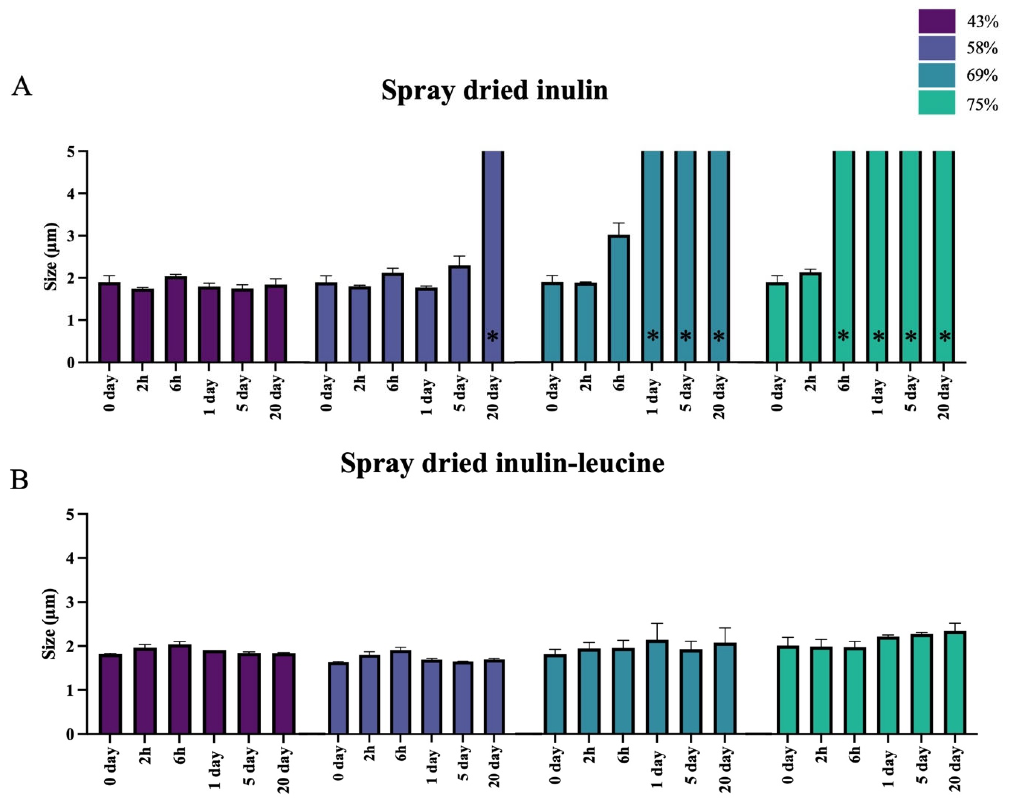 Although leucine’s dispersibility-enhancing effects are well established, its role in preventing moisture-induced destabilization remains less clearly defined. Due to its hydrophobic nature leucine may act as barrier against moisture induced destabilization. Previous research has shown that hydrophobic amino acids, including leucine, can provide moisture protection in spray dried powders [