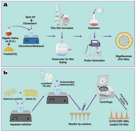 (a) Schematic representation of the Fisetin–Nigellasomes nanovesicles process. (b) Fabrication of Gelatin/Hyaluronic acid/Carboxymethyl cellulose microneedles (G/HA/CMC MNs) loading optimized Fisetin–Nigellasomes process.