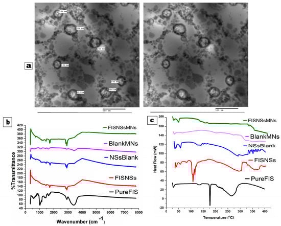 The thin-film hydration process was used to create FIS-NSs with little modification. A round-bottom flask was used to dissolve the calculated amounts of FIS (6 mg), Span 60, cholesterol, and N.S. in a 1:110 mL methanol/chloroform solution. The Stuart rotary evaporator (RE300, Wolf Laboratories, North Yorkshire, UK) was used to evaporate the organic solvent was evaporated under vacuum at 60 °C and 100 rpm using a rotary evaporator (RE-300, Wolf Laboratories, UK) []. Evaporation was completed when a thin, dry, clear layer formed on the flask wall. To remove any organic solvent residues, the film was vacuum dried in a desiccator for two hours. To hydrate the film, add 10 milliliters of phosphate-buffered saline (PBS, pH 7.4). FIS-NSs were produced by hydrating at 60 °C for one hour at 100 rpm. A Sonix TV immersion sonicator (Model SS-series, North Charleston, SC, USA) was used for 10 min to shrink the vesicles. Figure 1a shows the customized nanosuspensions of FIS-NSs, which were kept at 4 °C overnight before further characterization [].