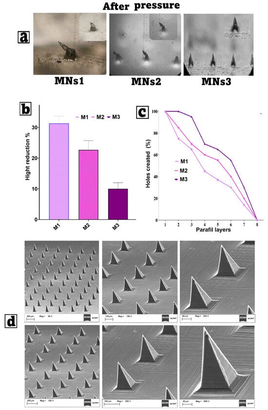The TA-XT2 Texture Analyzer (CT3, Brookfield, Engineering, Middleboro, MA, USA) was utilized in compression mode to assess the compression properties of MN arrays. The MN array underwent compression against an aluminum block with a force of 30 N and a compression rate of 0.1 mm/s. The heights of MN arrays were assessed pre- and post-compression utilizing a stereomicroscope (C-B10+, Optika Microscope, Bergamo, Italy). The percentage decrease in MN height resulting from compression was determined using Equation (3). Parafilm M® (Bemis Company Inc., Sheboygan Falls, WI, USA), a flexible olefin-based thermoplastic film that is often used to mimic the mechanical resistance of human skin, was used following a slightly modified procedure described by Elhabal []. To simulate manual insertion of MNs in the skin, an eight-layer film was folded, and MNs arrays were pressed against it with a 32 N force and 0.1 mm/s compression rate. The TA-XT2 Texture Analyzer was used for about 30 s. The array was then carefully removed from the Parafilm [,]. After unfolding the Parafilm layers, the holes created by insertion were examined using a C-B10 + stereomicroscope (Optika, Italy) by using Equation (4).