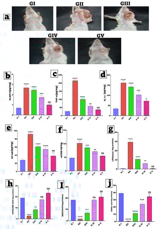 To assess the anti-inflammatory and anti-proliferative effects of fisetin treatment in breast cancer, essential tissue biomarkers were evaluated using ELISA kits in accordance with the manufacturer’s guidelines (MyBioSource, San Diego, CA, USA). The chosen biomarkers were selected due to their mechanistic relevance to the established biological effects of fisetin, specifically its influence on inflammatory, proliferative, and angiogenic pathways. Examine the serum for NLRP3 (NOD-, LRR-, and Pyrin Receptor Protein 3), TNF-α (Tumor Necrosis Factor-Alpha), IL-1β (Interleukin-1 Beta), NF-κB (Nuclear Factor Kappa B, nuclear translocation), and mTOR (Mammalian Target of Rapamycin) [,], as depicted in Figure 2.