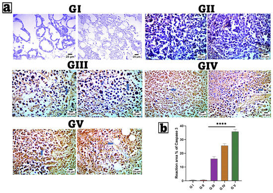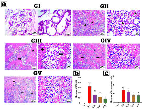 Female Swiss albino mice (5–7 weeks old, 20 ± 5 g) were obtained from the Animal House at the National Research Center in Giza, Egypt. They were acclimatized to a 12-h light/dark cycle and kept at a constant temperature of 22–24 °C for two weeks with free water and food. All animal experiments adhered to the National Institutes of Health’s Guide for the Care and Use of Laboratory Animals and the ARRIVE standards (National Experiments Council, 2011). The Experimental Protocol was authorized by Cairo University’s Faculty of Pharmacy’s Research Ethics Committee under the ethical approval number, 3770. At the end of the treatment, mice were anesthetized with a topical mixture of proparacaine hydrochloride (Alcaine®, Alcon Laboratories, Inc., Geneva, Switzerland) and benoxinate hydrochloride (BNP), and blood samples (0.5 mL) were collected from their retro-orbital plexus using heparinized capillaries and placed immediately on ice in EDTA-coated tubes. Samples were stored at −20 °C until they were analyzed. Mice starved overnight. The mice were subsequently sedated with xylazine (1 mg/kg) and ketamine (75–100 mg/kg) before being decapitated. Breast tumors were excised, numbered, weighed, and measured using a precision caliper with a 1 mm resolution. A portion of the breast tumor tissues removed from dead mice were rinsed with ice-cold saline to eliminate blood. To avoid protein degradation, each tissue sample was dried on sterile filter paper, weighed, and homogenized on ice in cold phosphate-buffered saline (PBS, pH 7.4) using a Teflon-glass homogenizer (IKA, Staufen, Germany). Homogenization was carried out at a ratio of 1 g tissue to 9 mL of buffer, yielding a 10% homogenate (w/v). The homogenates were centrifuged at 10,000× g for 15 min at 4 °C. The supernatants were carefully collected for biochemical analysis. Before analysis, homogenate aliquots were kept at −80 °C to preserve enzyme activity and prevent oxidation. The remaining half was processed for histopathological examinations.