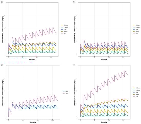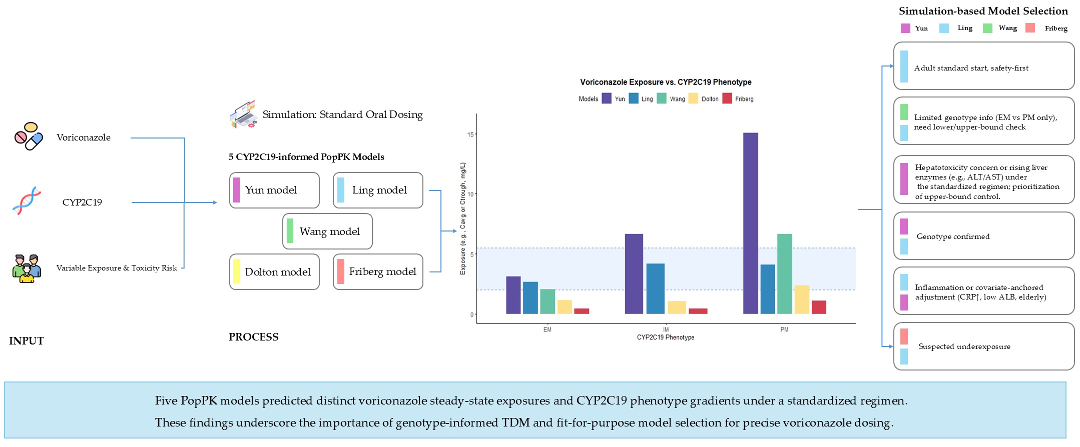 APA StyleLee, Y., Lee, N., Rhee, S.-j., & Kim, Y. (2025). Toward Genotype-Informed Dosing of Voriconazole: Head-to-Head Simulations Across CYP2C19 Phenotypes Using Population Pharmacokinetic Models. Pharmaceutics, 17(11), 1398. https://doi.org/10.3390/pharmaceutics17111398