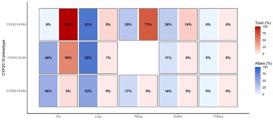- Wang: PM exceeded EM in exposure with lower clearance (AUCτ,ss 24.90 ± 5.73 vs. 78.92 ± 11.49 mg·h/L; Ctrough,ss 1.65 ± 0.53 vs. 6.05 ± 0.98 mg/L; CLss/F 8.42 ± 1.81 vs. 2.59 ± 0.41 L/h for EM vs. PM).