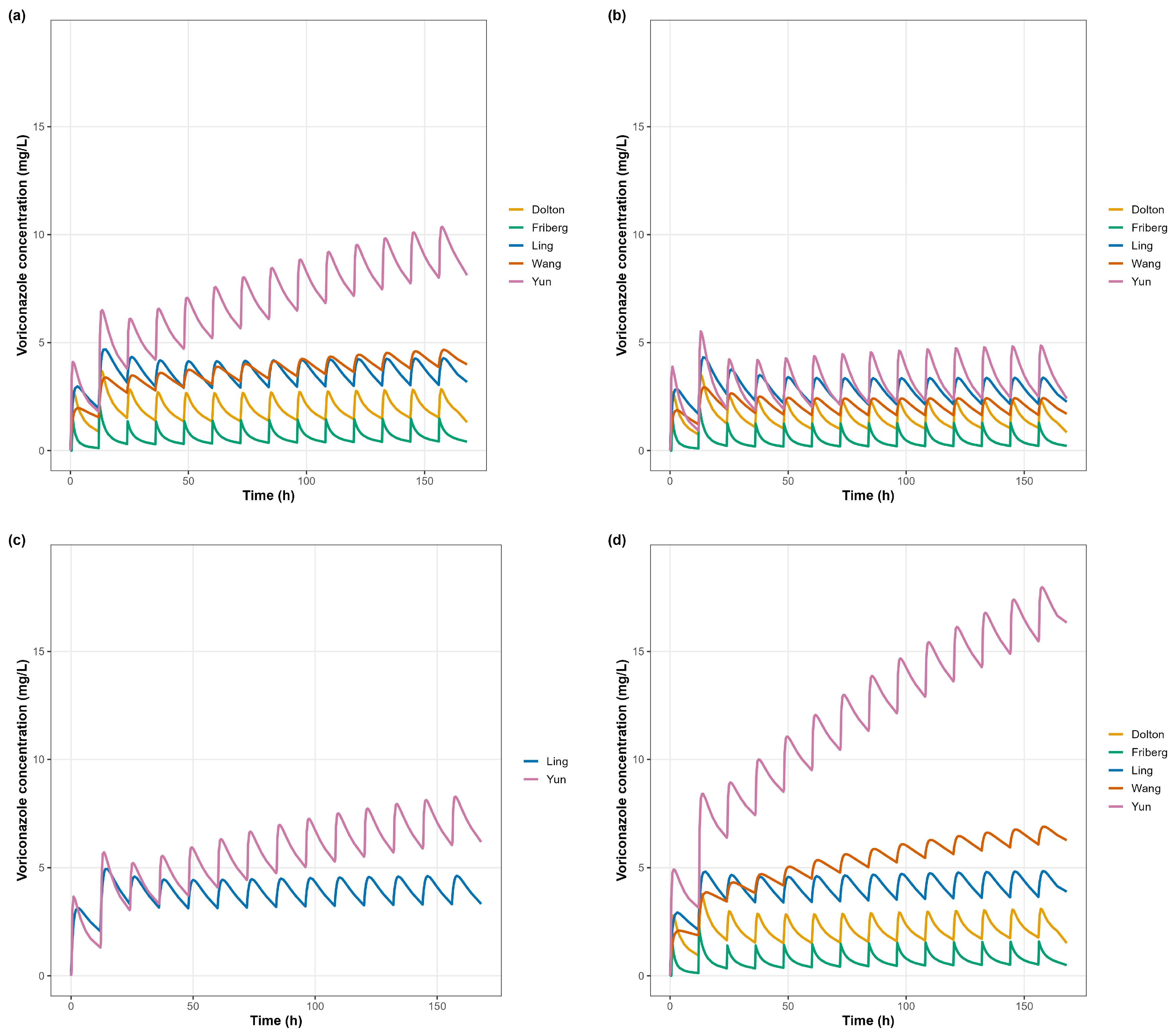 - Yun predicted the highest exposure and lowest clearance (AUCτ,ss 110.47 ± 85.79 mg·h/L; Cavg,ss 9.21 ± 7.15 mg/L; Ctrough,ss 7.96 ± 6.77 mg/L; CLss/F 3.19 ± 2.40 L/h).