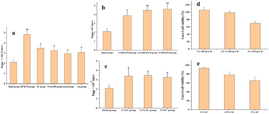 (a) Screening of absorption enhancer types in AB4 transport in the Caco-2 cell monolayer. (b) Screening of HP-β-CD concentrations in AB4 transport in the Caco-2 cell monolayer. (c) Screening of SC concentrations in AB4 transport in the Caco-2 cell monolayer. (d) Effect of HP-β-CD concentrations on cytotoxicity. (e) Effect of SC concentrations on cytotoxicity. Compared with the blank group, * p < 0.1 and ** p < 0.05.