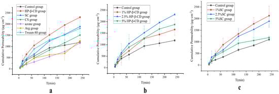 In order to verify the effects of the Caco-2 cell experiments, this experiment continued to investigate the effects of the six absorption enhancers (HP-β-CD, SC, CS, azone, Tween-80, and Arg) using the Franz diffusion cell. All six absorption enhancers exhibited different degrees of absorption effects (Figure 2a), among which HP-β-CD had the best pro-absorption effect, whereas SC and Tween-80 had comparable effects. SC is widely used as a food additive and can also be used as an absorption enhancer in suppositories, owing to its good safety profile. Accordingly, the corresponding HP-β-CD and SC were selected as absorption enhancers, and their absorption effects at different concentrations were analyzed. As shown in Figure 2b,c, 2.5% HP-β-CD and 1% SC, respectively, had the best absorption effects.
