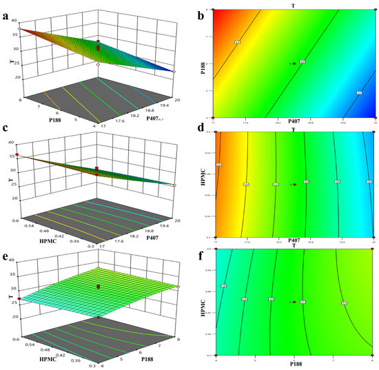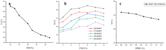 Effects of P407, P188, and HPMC contents on gelation temperature (a–c).
