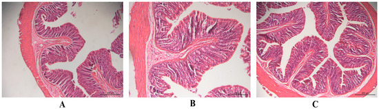 The pathological changes in the rectal tissue of rats in each group after rectal administration for 7 d (×200 nm): (A) blank control group, (B) HP-β-CD-AB4-ISG group, and (C) SC-AB4-ISG group rectal administration.