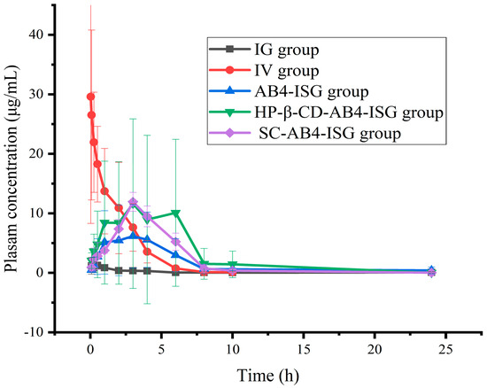 The mean plasma concentration versus time curve is shown in Figure 7, and the main pharmacokinetic parameters are shown in Table S5 (Supplementary Materials). After the administration of a 200 mg/kg AB4 solution in rats via the IG route, the peak time (Tmax) was 0.542 ± 0.246 h, indicating more rapid absorption after IG administration. Compared with that of the IV injection group, the peak concentration (Cmax) was lower, and the absolute bioavailability was 0.16% for the IG group. Compared with that in the IG group, the Tmax and half-life (t1/2) in the AB4-ISG group were prolonged, and the absolute bioavailability was 38.45%, which was significantly higher than 0.16%. These findings indicated that the formulation of AB4 into a rectal ISG could significantly increase the drug-retention time in the rectum, thereby increasing its absorption and bioavailability. The Cmax for the HP-β-CD-AB4-ISG and SC-AB4-ISG groups increased significantly, and the absolute bioavailabilities were 72.05% and 60.34%, respectively, which increased by 1.88 and 1.57 times compared with those for the AB4-ISG group. These findings showed that the addition of appropriate concentrations of absorption enhancers to ISG formulations can increase the extent of drug absorption. Therefore, rectal ISGs can improve the absorption of AB4. Moreover, ISG formulations containing appropriate absorption enhancers can increase drug absorption by nearly two-fold compared with ISGs without absorption enhancers.