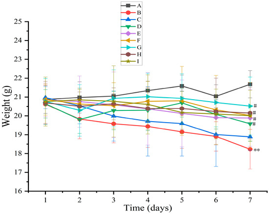 Effect on the body weight of mice. A: Blank group, B: model group, C: positive group, D: AB4-ISG low-dose group, E: AB4-ISG high-dose group, F: HP-β-CD-AB4-ISG low-dose group, G: HP-β-CD-AB4-ISG high-dose group, H: SC-AB4-ISG low-dose group, and I: SC-AB4-ISG high-dose group. Compared with the blank group, ** p < 0.01; compared with the positive group, # p < 0.05.