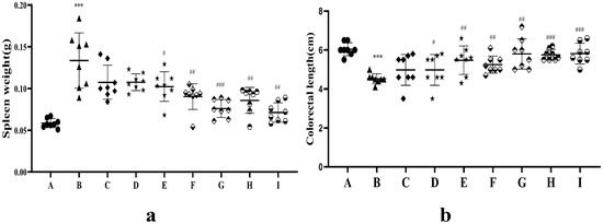 (a) Spleen weight and (b) colon length after treatment.●A: Blank group, ▲B: model group, ◆C: positive group, ★D: AB4-ISG low-dose group, ★E: AB4-ISG high-dose group,